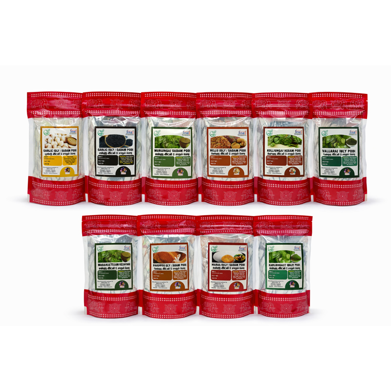 Our 10 Sadam & Idly Podi Variety Combo. This combo includes 10 delicious varieties made with authentic ingredients and traditional recipes.