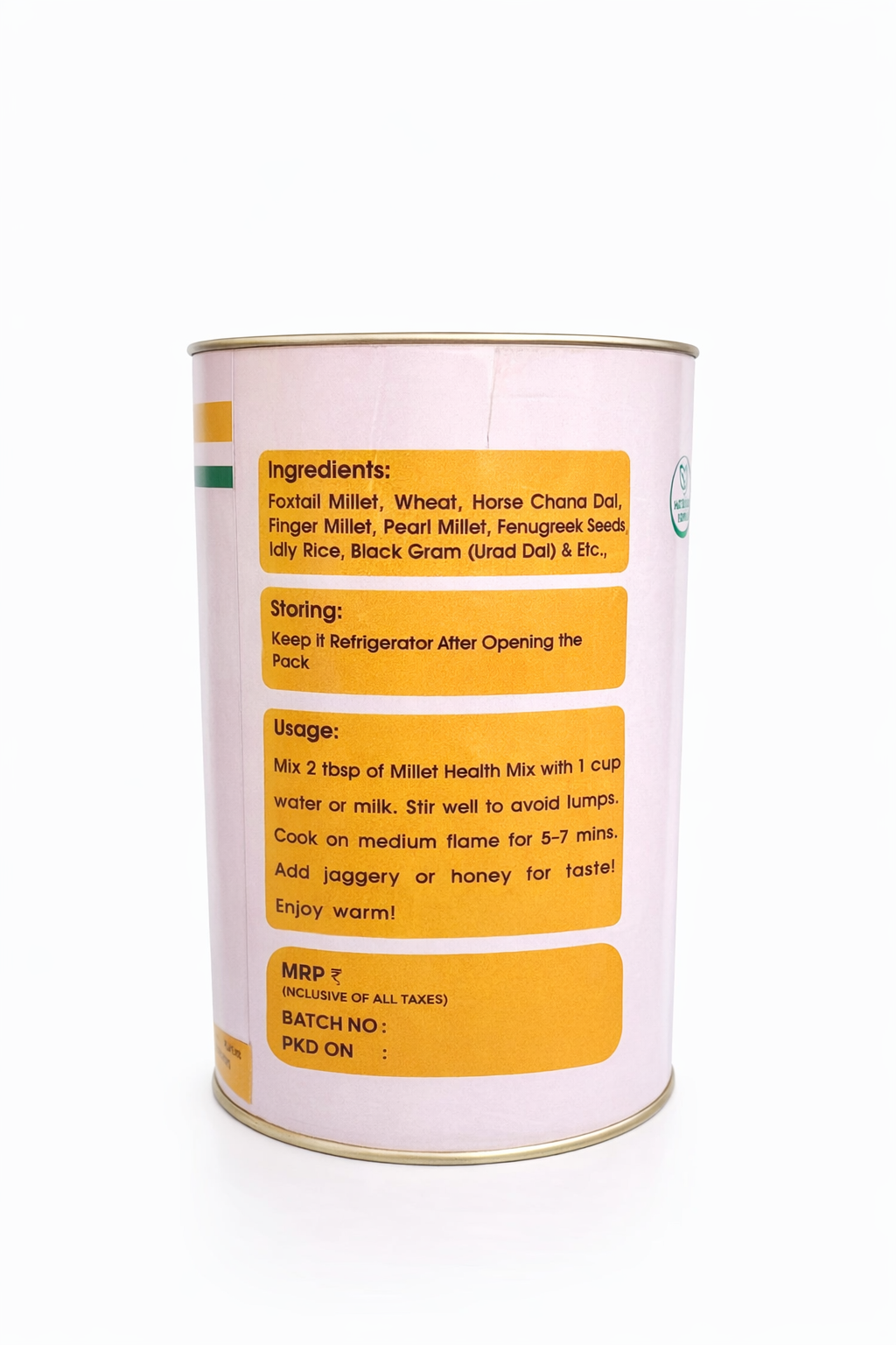 A wholesome and traditional Millet Health Mix made from a carefully selected blend of natural millets, grains, and pulses including foxtail millet, finger millet (ragi), pearl millet (bajra), wheat, and black gram. This nutrient-rich mix is designed to support daily health by providing natural energy, essential nutrients, and sustained nourishment.
